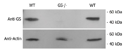 图2:在GS敲除细胞裂解液中 星空体育网页版,anti-GS抗体未检测到谷氨酰胺合成酶.