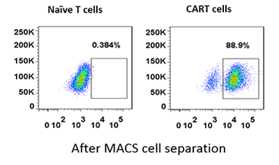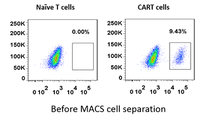 实验采用初始T细胞作为CAR阴性的细胞对照,以9,43% CAR阳性T细胞与初始T细胞混合作为阳性待分离样品,通过生物素标记的抗体MonoRab™ Rabbit Anti-Camelid VHH Cocktail [Biotin](GenScript,A02015)和抗生物素的磁珠进行CART细胞的磁分离,将得到的细胞进行流式细胞分析,以验证磁分离的效果。如图所示,经过磁分离后,CAR阳性细胞的比例从预混的9,43%提升至分离后的88 星空体彩app官方,9%,数据表明该抗体可以很好的应用于CART细胞的磁分离。。