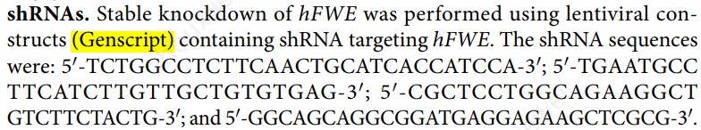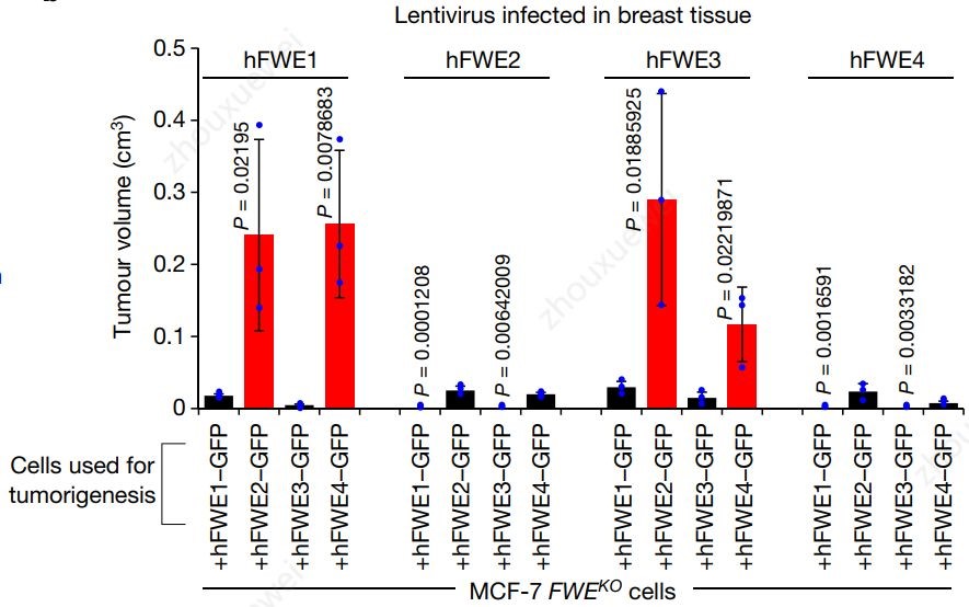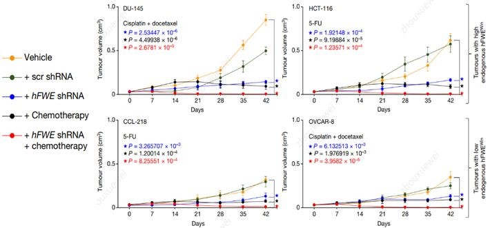 研究者采用shRNA(short-hairpin RNA)方法,敲低hFWE-Wt HCT-116细胞hFWE表达,细胞移植后发现肿瘤体积下降。