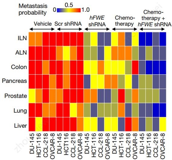 图6:hFWE shRNA,化学疗法以及hFWE shRNA和化学疗法联合治疗对转移的影响。