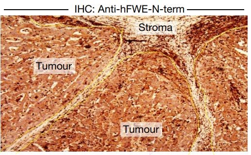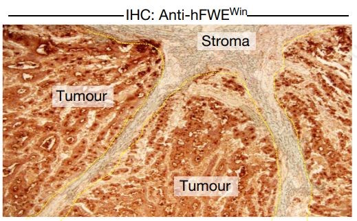 hFWE-N端(靶向四种亚型)抗体处理样本时,肿瘤细胞和基质细胞均被染色,hFWE-Win抗体处理样本时肿瘤细胞被染色,说明肿瘤细胞高表达hFWE-Win蛋白,并在hFWE-Lose基质细胞周围生长 星空体育网页版, 。
