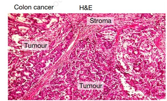 图3:上为hFWE-N端抗体处理肿瘤和基质细胞样本,左为HE染色结肠癌和基质细胞样本 星空注册,右为hFWE-Win抗体处理结肠癌样本。
