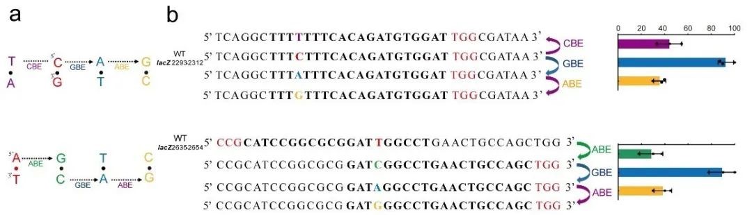 中科院天津工业生物所张学礼研究员带领的微生物代谢工程研究团队和毕昌昊研究员带领的合成生物技术研究团队联合攻关,设计构建了胞嘧啶脱氨酶-nCas9-Ung蛋白复合物,创建出新型糖基化酶碱基编辑器(GBE, glycosylase base editors) 星空体育网页版,开发了可实现嘧啶和嘌呤间颠换的单碱基基因编辑系统,研究成果发表于Nature Biotechnology(图3),基于该系统,国际上首次在微生物中实现任意碱基编辑,在哺乳动物细胞中实现C-G碱基特异性颠换。