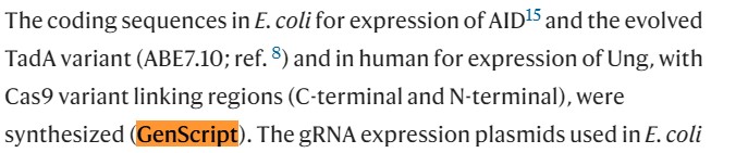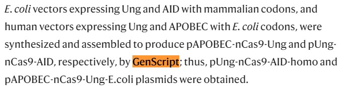 在张学礼和毕昌昊团队本次研究中的变体编码序列由星空体彩app官方提供,不仅如此,用来生产pAPOBEC-nCas9-Ung和pUng-nCas9-AID的E.coli载体及human 载体均由星空体彩app官方合成组装。我们旨在让研发更容易,携手全球科学家一起攻克难题。