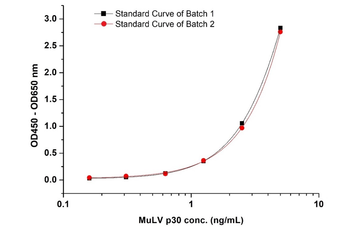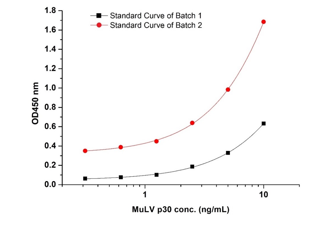 在检测过程中,将标准品或样品加入包被有抗 MuLV p30 单抗的捕获板中 星空官网,样品中的 MuLV 被特异性捕获,随后,加入生物素标记的抗 MuLV p30 单抗作为检测抗体,与已捕获的 MuLV 结合形成复合物,接着,加入链霉亲和素-HRP,与生物素标记的检测抗体结合,进一步增强信号,经过充分洗涤后,加入 TMB 底物溶液引发显色反应,反应终止液的加入会使颜色由蓝色转变为黄色,最终,通过酶标仪在 450 nm 和 650 nm 波长下测量颜色的吸光值,并依据标准曲线对样品中 MuLV 的浓度进行精准定量, 。