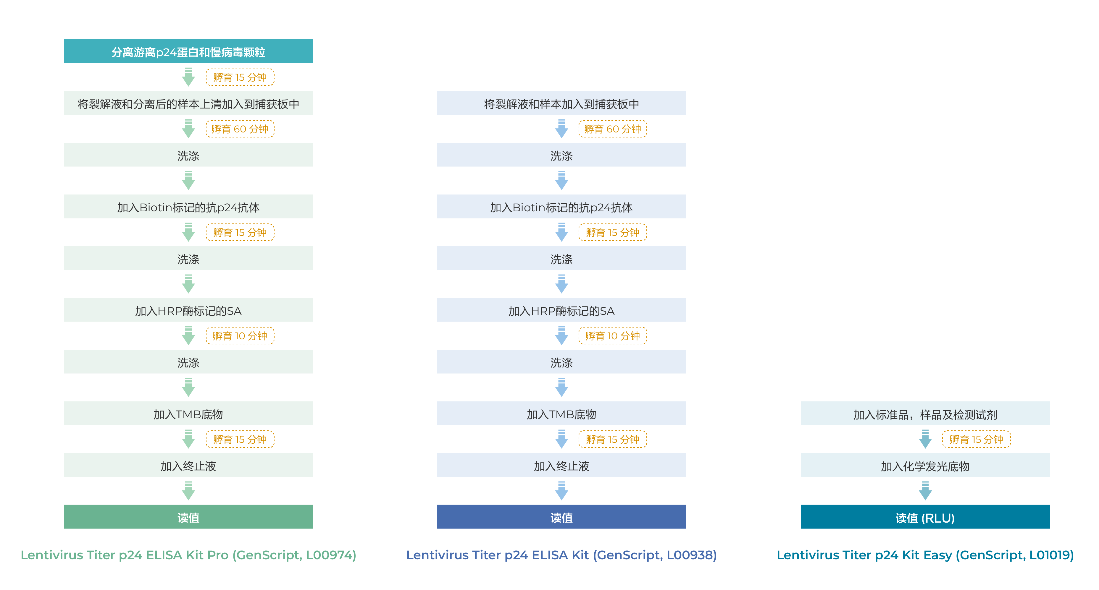 Lentivirus Titer p24 ELISA Kit Easy 检测的是总p24蛋白,通过化学放光法进行测定,孵育时间为15分钟,检测过程无需洗涤,全程耗时约30分钟。