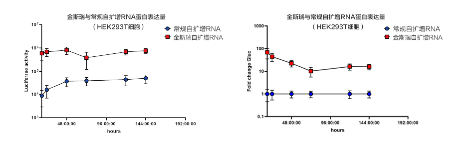实验结果:星空体彩app官方saRNA基于GS-saRNA-1载体合成,m5C修饰,具有不同的经过筛选验证的复制酶元件和修饰,与常规saRNA 比较,星空体彩app官方设计的GS-saRNA 具有更高的初始及持续蛋白表达量 星空下载,表达量可以高达10倍, 。