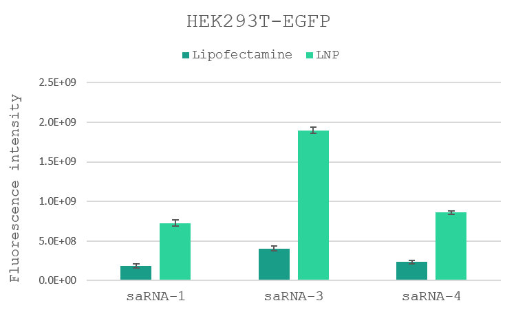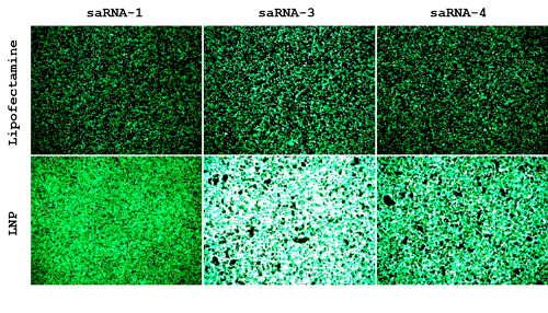 10 ng 的 EGFP saRNA 通过 LNP (SM102) 或 Lipofectamine™ MessengerMAX™ (Thermo) 转染到 HEK293T 细胞中,转染后 48 小时,通过荧光显微镜检测并成像 EGFP 信号 星空官方网站,使用 Image J 软件对信号强度进行定量分析, 。