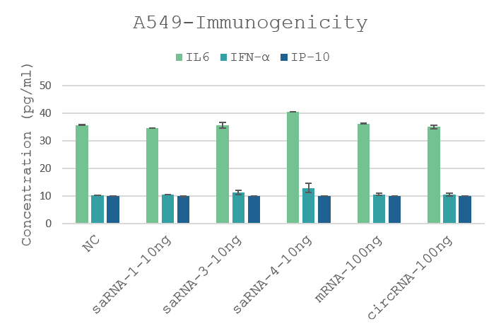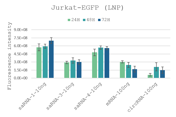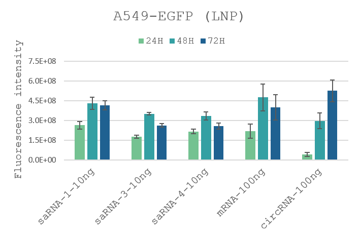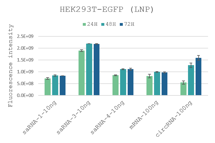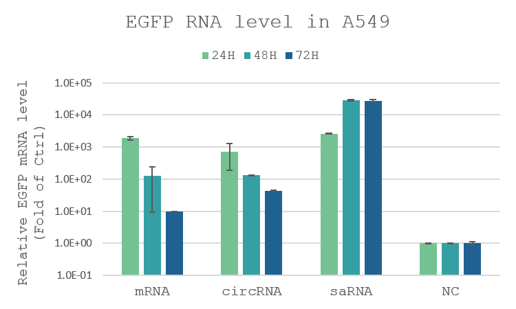 在A549细胞中,用LNP(SM102)转染100ng EGFP mRNA 星空体彩app官方,环状RNA或saRNA(saRNA-1),通过RT-qPCR检测EGFP的RNA水平,评估普通线性mRNA和saRNA的半衰期, 。