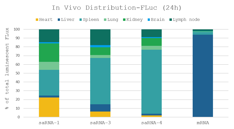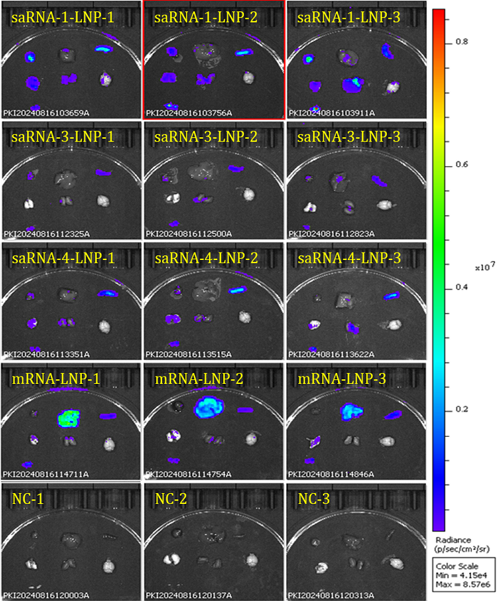 SM102-DiR标记的Fluc mRNA或saRNA通过静脉注射进入小鼠,剂量为0.25 mg/kg,每组3只小鼠。注射24小时后,小鼠通过腹腔注射100 μL的30 mg/mL D-荧光素。使用体内成像系统对小鼠进行活体成像,观察小鼠体内的总荧光分布。在此之后,小鼠被处死,成像并定量分析了脑、心脏、肺、肝、肾、淋巴结和脾的荧光分布。