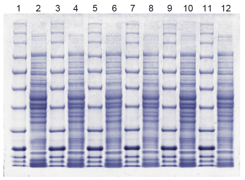 凝胶:SurePAGE,4-12%,12 wells(Genscript,M00653) 染色:eStain蛋白染色仪(Genscript,L00657C),9min 30s Lane1,3,5,7,9,11:4μl Color Prestained Protein Standard,Broad Range (11-245kDa) (P7712S) Lane2,4,6,8,10,12:6μl E,coli cell lysate 星空全站体育.