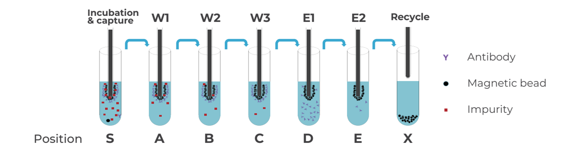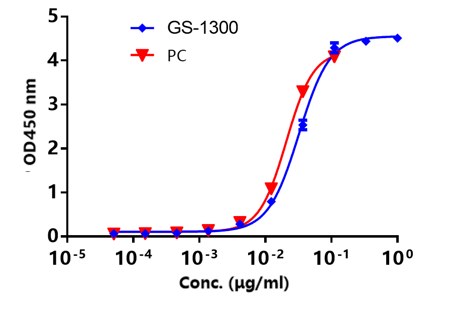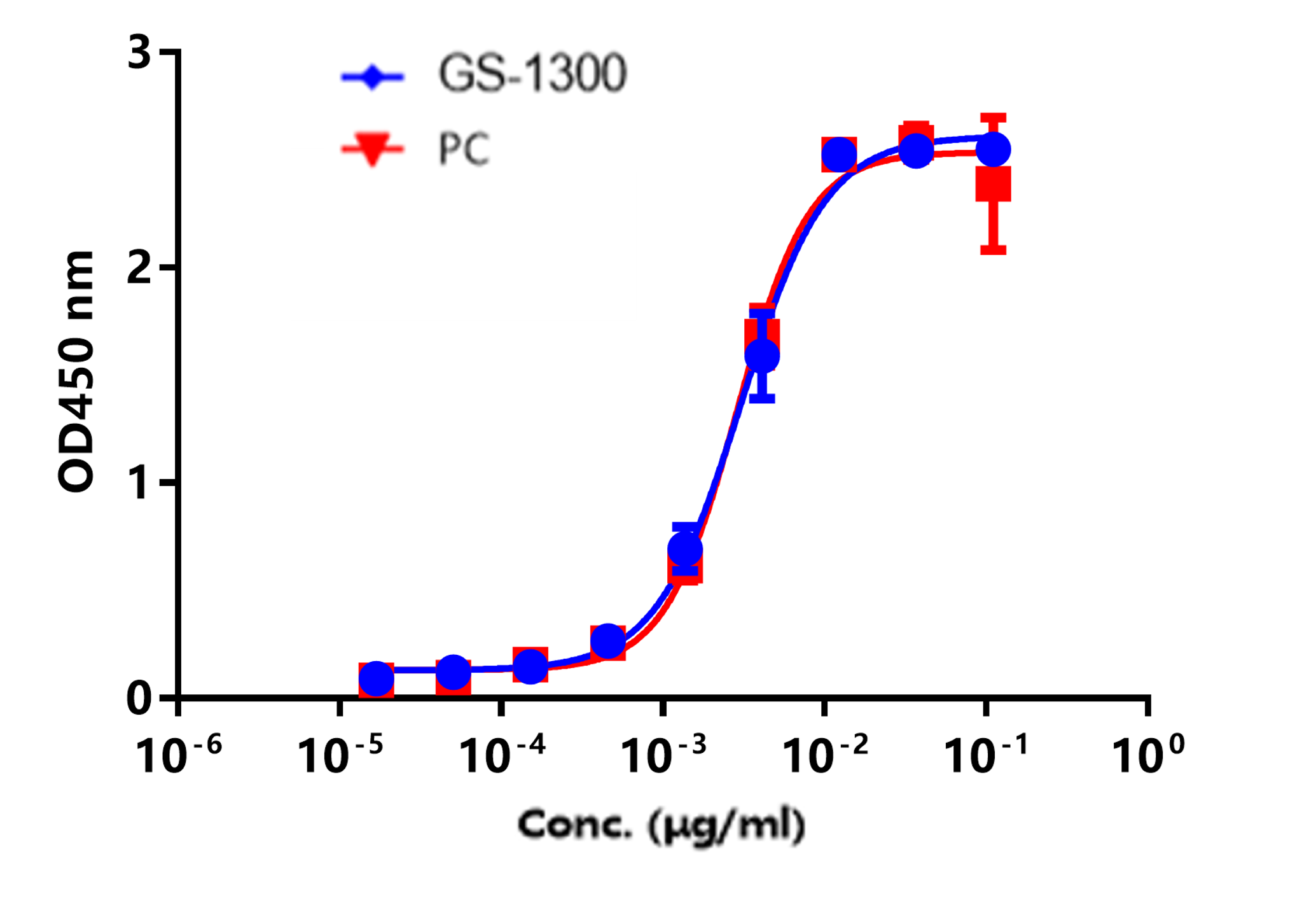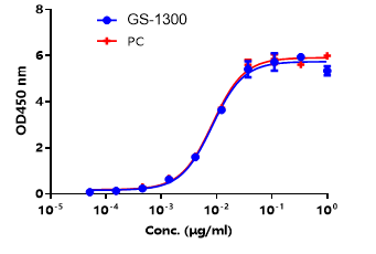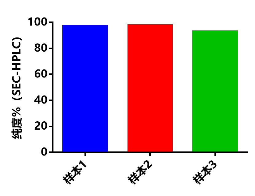 图1:AmMag™ Quatro 1300与手动磁珠纯化方法性能一致取30 mL过表达Anti-E2 hIgG 的CHO细胞发酵液, 采用BLI方法测定抗体滴度为923 星空全站体育,3 μg/mL。取用2 mL星空体彩app官方Protein A Magnetic Beads (Cat# L00695),分别用AmMag™ Quatro 1300全自动蛋白/抗体磁珠纯化系统和手动磁珠法进行样本纯化。随后,对纯化后的抗体进行收率、纯度(SEC-HPLC)、结合活性检测。结果表明:两种纯化方式的回收率、纯度( 均>95%)一致,活性均与阳性对照样品相当。 PC: 阳性对照(介质纯化样品); GS-1300: 用GenScript AmMag™ Quatro 1300纯化的样本;GS-手动:用GenScript磁珠(Cat# L00695)手动法纯化的样本。 。